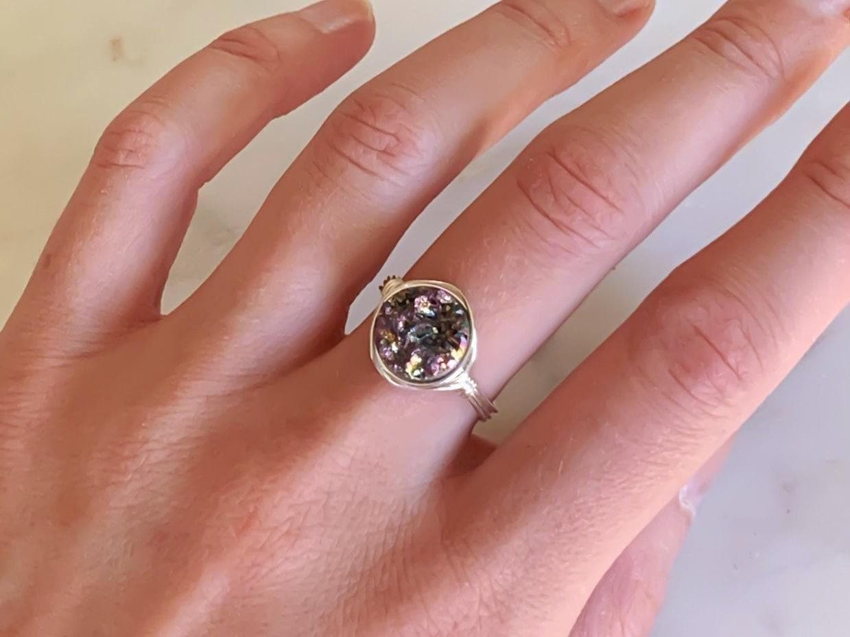 This beautiful, sparkly druzy ring is made with a titanium coated natural crystal druzy gemstone that is wire wrapped in your choice of metal.